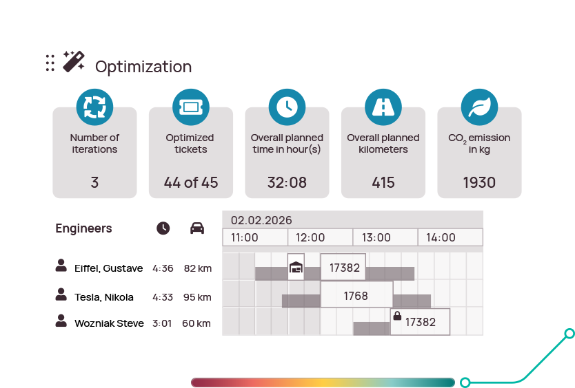 Routen werden automatisch unter Berücksichtigung von Fahrzeiten, SLAs, Echtzeit-Verkehr sowie Abhol- und Lieferorten für Ersatzteile neu berechnet. TechnikerInnen erhalten stets die schnellste und effizienteste Route.