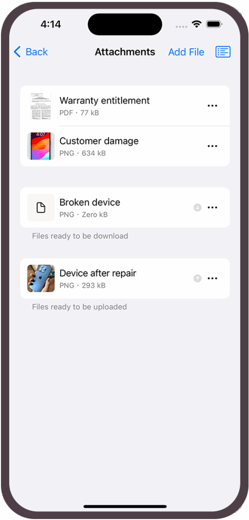 Ihre Techniker können auf einfache Weise Fotos und Dokumente erfassen und an Arbeitsaufträge anhängen, was die Zusammenarbeit zwischen den Technikern im Außendienst und dem Backoffice verbessert. Dies reduziert den Bedarf an Papierkram und trägt zur Rationalisierung der Kommunikationsprozesse bei.
