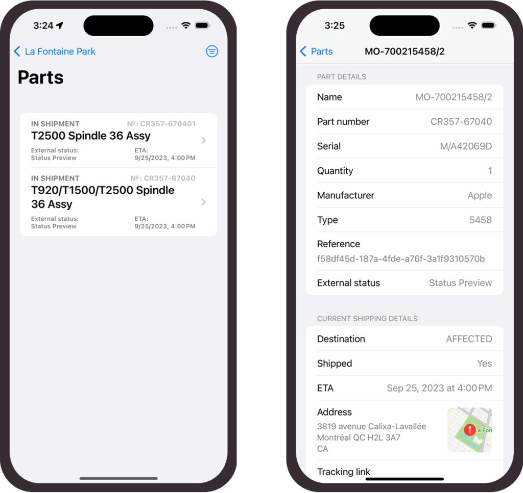 Die Techniker haben Zugriff auf alle Teile, die den ihnen zugewiesenen Tickets entsprechen. Optimale Rückverfolgbarkeit der Teile durch Zugriff auf Teiledetails, Informationen über Abhol- oder Ablieferungsorte und einfache Bestätigung des Teileerhalts.