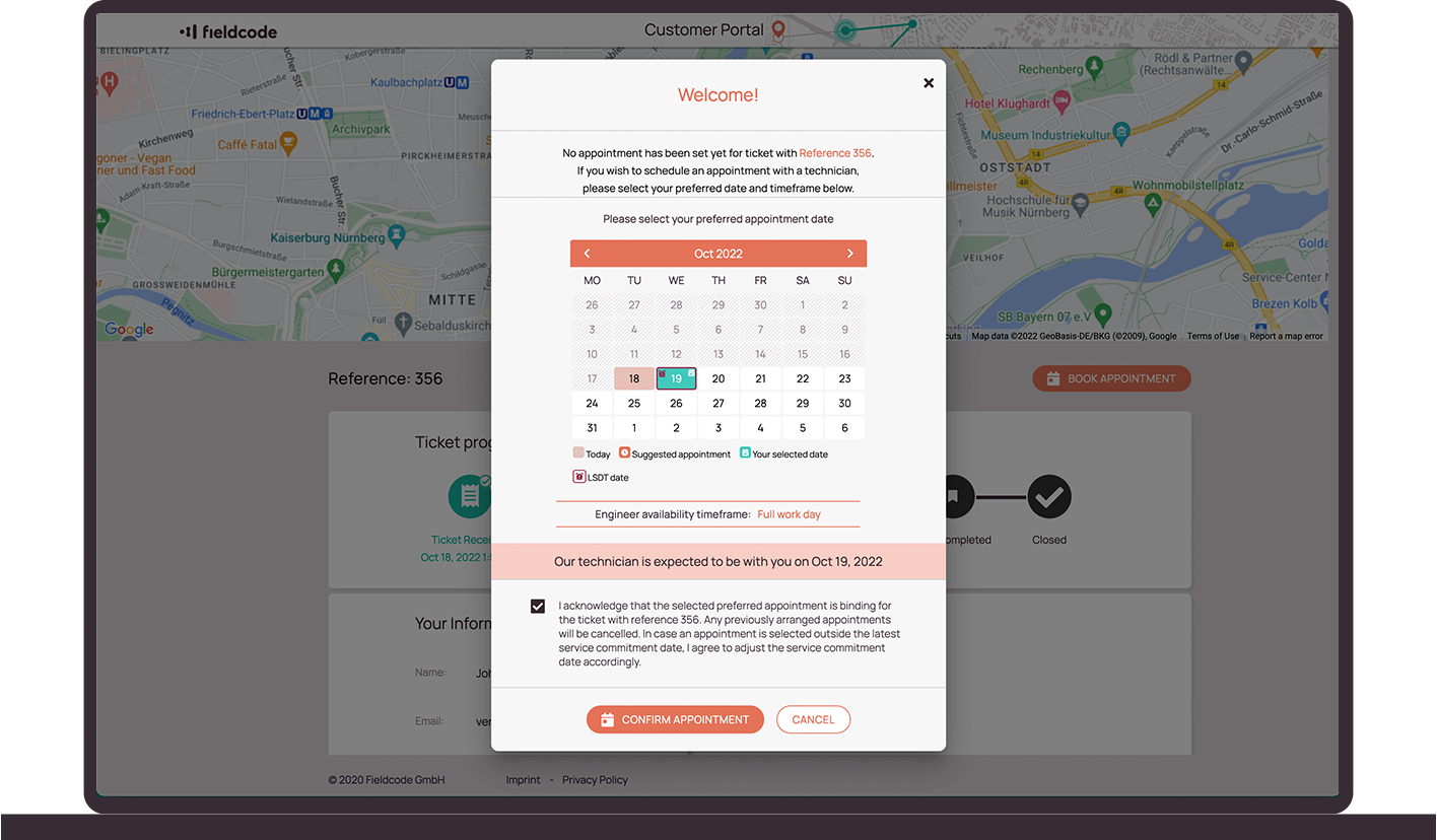 Your customers book, reschedule, or cancel appointments by themselves; no emails or calls needed. Offered time slots reflect real availability, skills, SLAs, and part readiness. When a customer makes a change, the system updates automatically, keeping routes consistent, schedules accurate, and preventing overbooking.