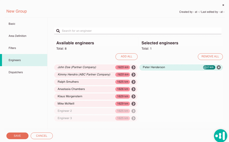 Fieldcode’s timeline and grouping feature allows you to organize engineers into subgroups on the timeline by city, province, or customer base. This setup streamlines dispatching, ensuring that the right technician is always available for the right job. The system also shows the distance of each technician from their designated zone, making it easier to select the best match for each task.