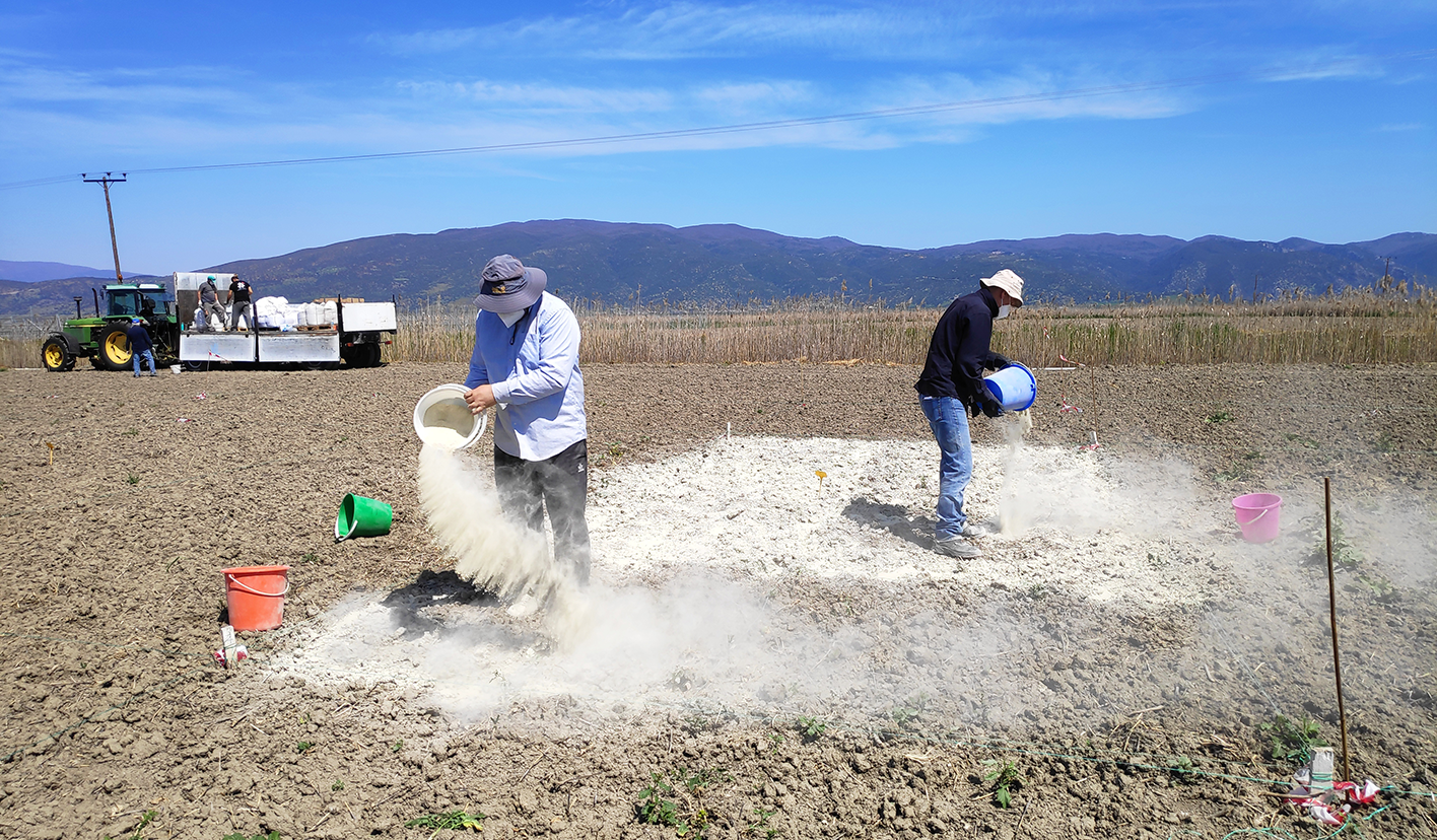 We conducted the first large-scale EW field experiment ever carried out in Greece. The scope entailed learning how to create an optimal environment for the weathering process and measuring the weathering rate. Our research team chose a large-scale cotton field for their EW experiments in Thessaly, surrounded by mountains enriched in olivine-rich rocks, to add olivine-rich rock dust and biochar to the experimental soil. Biochar – an artificially created charcoal – when applied, it can improve soil quality, increase crop yield, and store carbon dioxide for extended periods, packing a bigger punch towards CO2 removal.