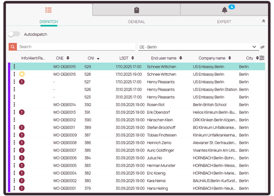 Los trabajos se asignan automáticamente en función de la ubicación, certificaciones del técnico (p. ej., SCADA, sistemas de peajes), disponibilidad y urgencia —sin intervención manual.