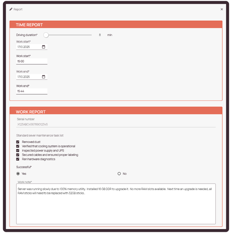 Los técnicos cierran los trabajos digitalmente desde el campo, incluyendo fotos, firmas y formularios de cumplimiento. Estos datos fluyen al instante hacia los paneles y los informes, eliminando la necesidad de introducción manual, hojas de cálculo separadas o llamadas de seguimiento para confirmar estados.