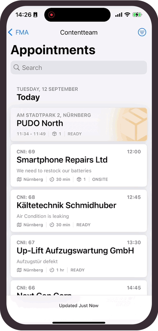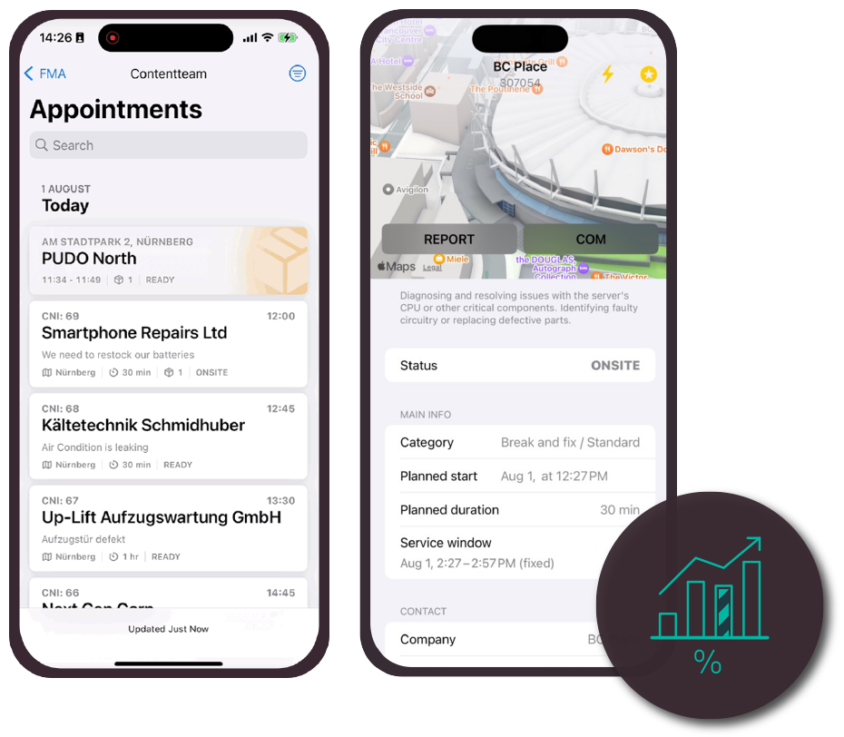 Respectez vos SLAs grâce à un accès fiable aux pièces. Contrairement aux FSM classiques qui traitent la logistique séparément, Fieldcode planifie les échanges comme des tâches : itinéraires, horaires et optimisation inclus. Que vous utilisiez un réseau FSL fixe ou un PUDO transactionnel, Fieldcode prend en compte horaires, emplacement, SLA et disponibilité des pièces sans planification manuelle.
